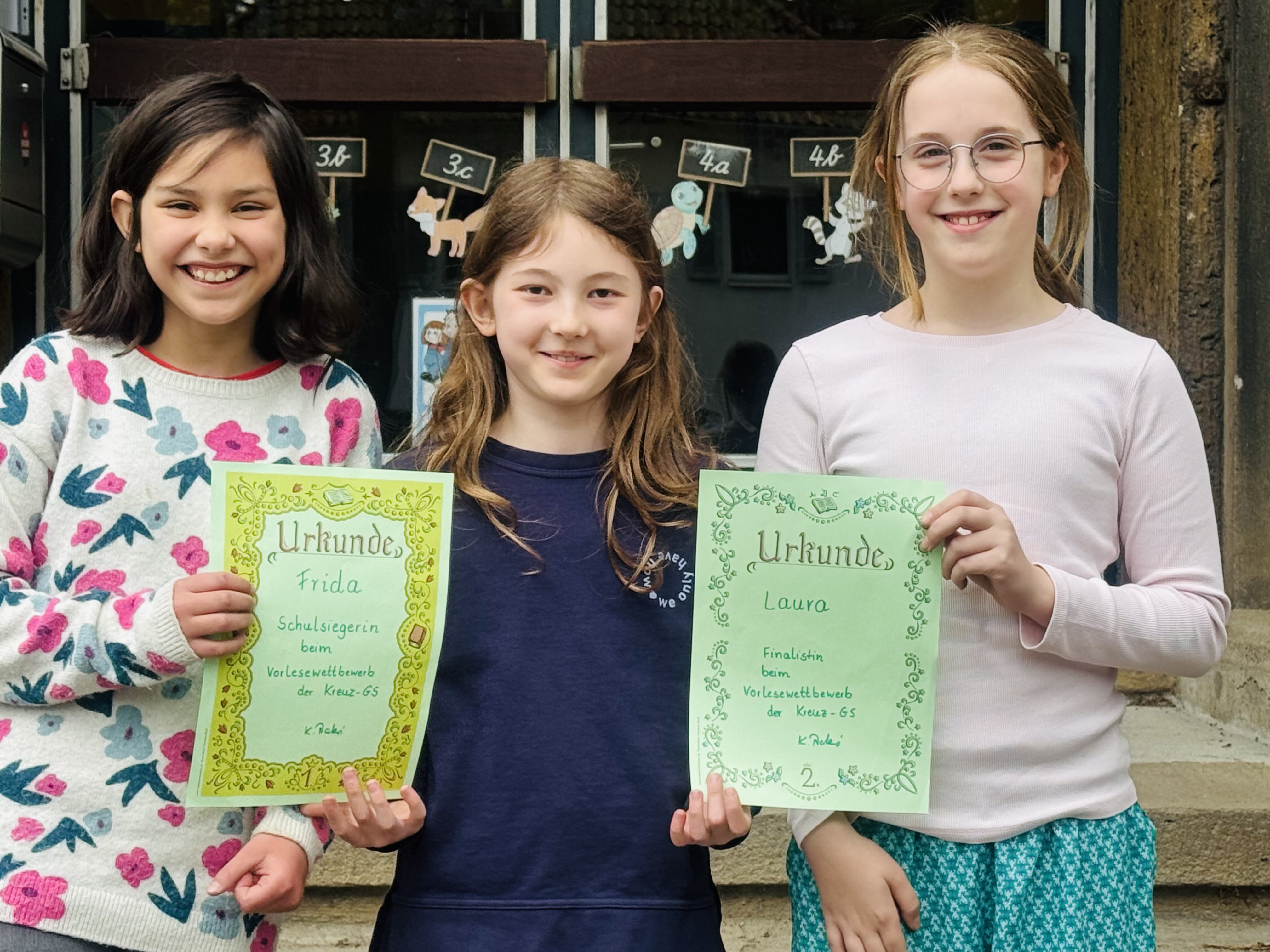 Nachdem die vierten Klassen in den letzten Wochen das Vorlesen von selbst ausgewählten und auch fremden Texten intensiv übten, kürten sie ihre Klassensiegerinnen. Am 9.4. wählte eine Jury aus den Klassenlehrerinnen und Frau Pratesi im Beisein der gesamten Jahrgangsstufe dann die Schulsiegerin. Die 4a schickte Mariko ins Rennen, für die 4b las Frida und für die 4c trat Laura an. Alle drei Finalistinnen lieferten eine gute Leistung ab. Als Gewinnerin vertritt Frida unsere Schule nun in der nächsten Runde und misst sich im Vorlesen mit Kindern anderer Grundschulen. Wir gratulieren ganz herzlich und wünschen viel Erfolg in der nächsten Runde!