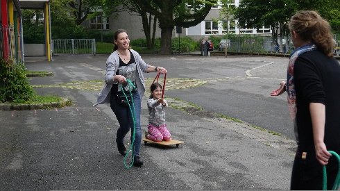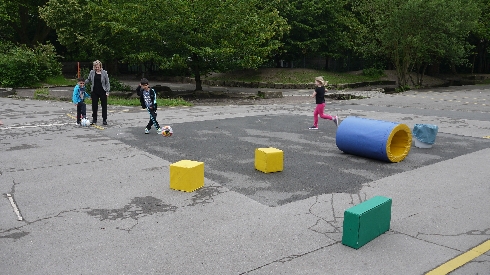 in der Turnhalle, ein Parcours zum Rollbrettfahren auf dem Schulhof sowie Übungen zum Thema Fußball.