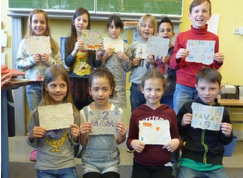 dass es ganz schön lange dauert, bis so kleine Zeitungsstücke zu neuem Papier werden. Der Mann und die Frau von der „blauen Tonne“ haben uns erklärt, dass das richtige Papier, das wir auch jeden Tag in der Schule benutzen, natürlich von Maschinen geschöpft und hergestellt wird. Trotzdem ist das natürlich ganz schön viel Arbeit. Wir haben uns dann gefragt, ob denn jedes Blatt Papier und die Hefte und Bücher in unserer Klasse alle vorher mal Altpapier waren. Wir haben erfahren, dass das leider nicht so ist.