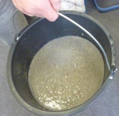 Die beiden Begleiter der Tonne haben uns erklärt, dass wir die Schüsseln mit dem Wasser und der Zeitung in einen Eimer gießen sollen. Das Ganze wurde dann mit einem Stabmixer püriert.